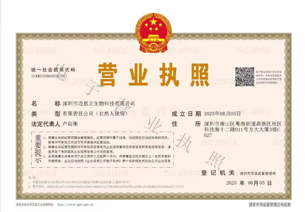 深圳市迈思立生物科技有限公司成立于2025-08-05,法定代表人为卢衍衡,注册资本为100万元,统一社会信用代码为91440300MAERXEG90J,企业注册地址位于深圳市南山区粤海街道高新区社区科技南十二路011号方大大厦3楼C027,所属行业为化学原料和化学制品制造业,经营范围包含:专用化学产品制造(不含危险化学品);技术服务、技术开发、技术咨询、技术交流、技术转让、技术推广;生物化工产品技术研发;新材料技术推广服务;工业酶制剂研发;生物饲料研发;生物农药技术研发;生物有机肥料研发;复合微生物肥料研发;基础化学原料制造(不含危险化学品等许可类化学品的制造);化妆品批发;化妆品零售;食品添加剂销售;饲料添加剂销售;特殊医学用途配方食品销售;医学研究和试验发展;国内贸易代理;进出口代理。(除依法须经批准的项目外,凭营业执照依法自主开展经营活动) 化妆品生产;药品生产;药品委托生产。(依法须经批准的项目,经相关部门批准后方可开展经营活动,具体经营项目以相关部门批准文件或许可证件为准)。企业当前经营状态为存续。